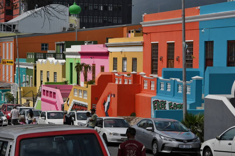 Der Opa steuerte zunächst zum Bo-Kaap. Das ist ein Stadtviertel von Kapstadt und wurde durch seine bunten Häuschen ein begehrtes Ziel für Touristen. Aber auch Werbespots wurden hier in dieser Kulisse gedreht. Das Bo-Kaap ist etwa einen Quadratkilometer groß. Der Stadtteil zeichnet sich durch enge, steile Gassen und in unterschiedlichen grellen Farben gestrichene Fassaden aus. Der Baustil ist eine Synthese aus kapholländischer und Edwardianischer Architektur, sagt Wikipedia.